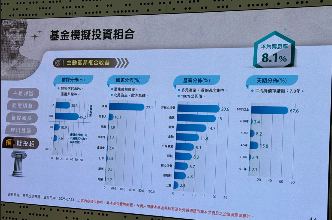 另一檔主動富邦複合收益(00983D) ,則是彈性配置複合券種,適合希望以投資等級信評為主,並願意適度投資非投等債券,追求增加債息收入機會之投資人。(如下圖,記者李錦奇攝影)