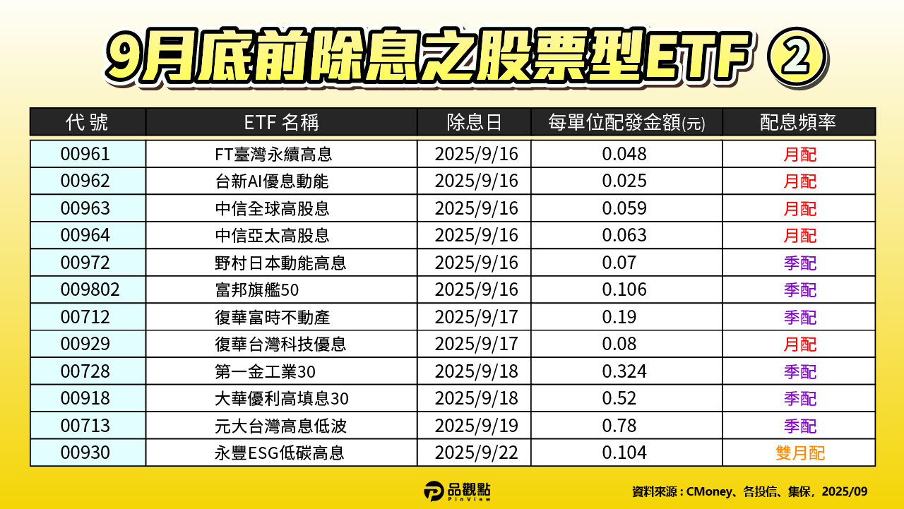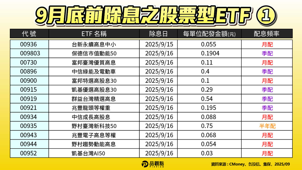 ETF九月除息高峰來囉!還有25檔股票型ETF即將陸續登場除息,總受益人數超過377萬,首先要打頭陣的是台新永續高息中小(00936),下週一(9/15)除息,想領息的話,最後買進日只剩今天;另外,9月16日將是高峰,當天有18檔上陣,包括保德信市值動能50 (009803)、群益台灣精選高息(00919)、富邦特選高股息30(00900)等人氣ETF。