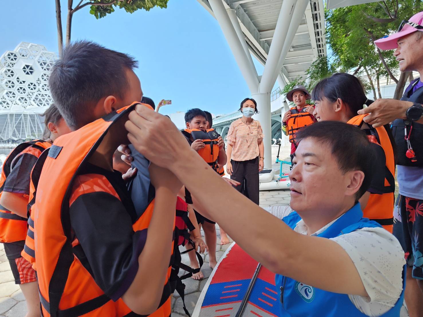 ↑圖說:.海洋局長石慶豐細心幫多納國小的學生穿著救生衣。(圖片來源:高雄市海洋局提供)