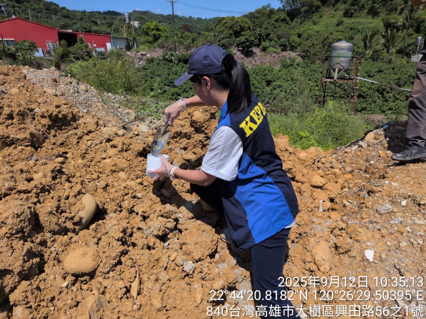 高雄市大樹區一處農地遭人非法回填營建混合物,環保局12日巡查時當場查獲,立即通報檢方介入,後續將由環保、檢警聯手追查背後責任人,嚴懲破壞國土的不法行為。