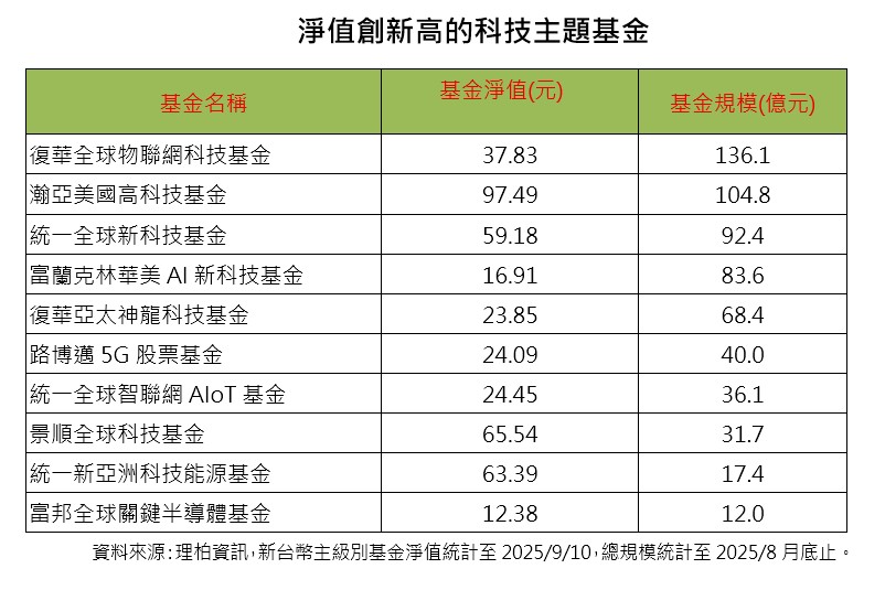 全球科技主題基金,受惠美、台等市場科技股驚驚漲,績效吃大補丸,推升多檔基金淨值創新高,並帶動規模增長,成為跨國投資股票型基金亮點。其中,復華全球物聯網科技、瀚亞美國高科技、統一全球新科技、富蘭克林華美AI新科技、復華亞太神龍科技等規模居前之基金,除以美國科技股為主軸,還布局觸角延伸至台、日、韓以及近期表現強勢的陸港股AI供應鏈族群,掌握各區域產業類股投資機會。