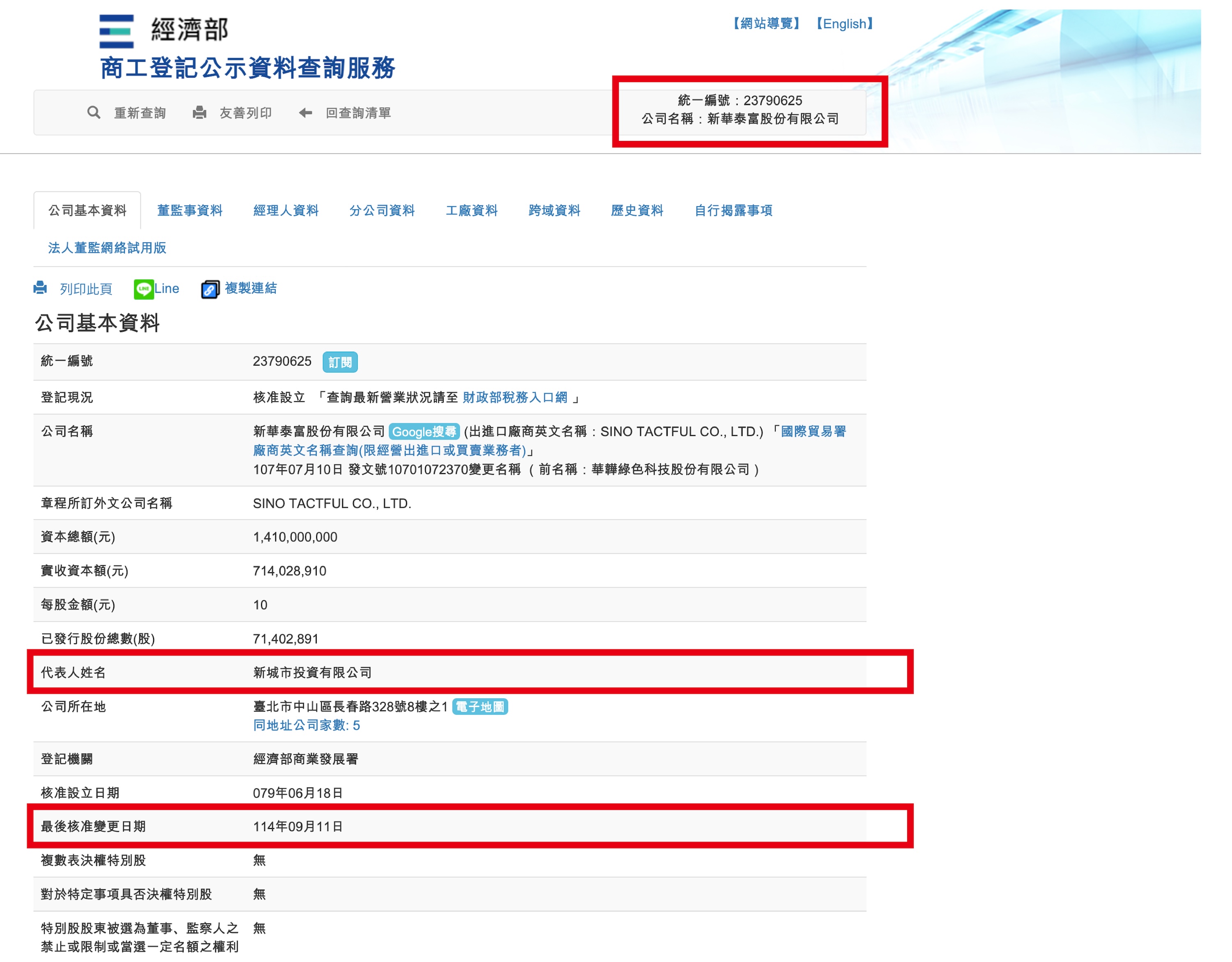 圖說:商發署核准新華泰富辦理變更登記,新任董事長為新城市投資公司。圖片來源:經濟部官網。