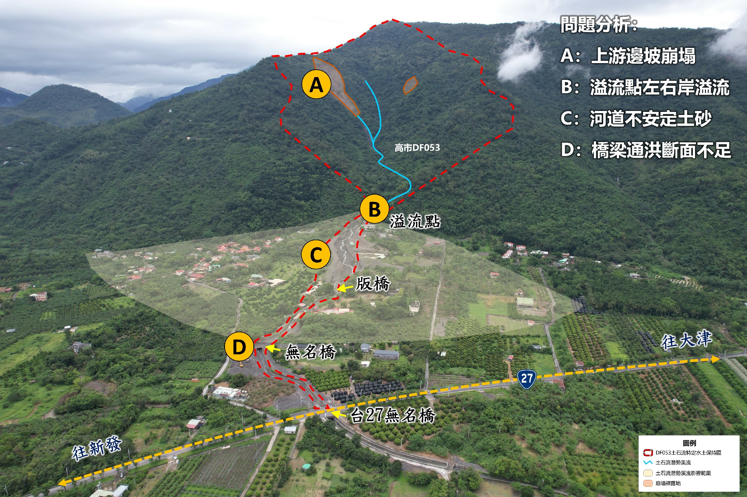 為回應地方訴求並提升防災效能,高雄市政府水利局已規劃劃設「高市DF053土石流特定水土保持區」,並於9月12日舉辦公聽會,向居民說明劃定必要性及後續治理藍圖。規劃範圍涵蓋上游至中下游重要集水區域,並經水文分析與土石流模擬,提出多項工程措施,包括增建導流堤防、沉砂池,拓寬河道護岸,施作固床工,以及改建便橋,預計3至5年內完成,以有效降低災害對聚落與基礎設施的威脅。