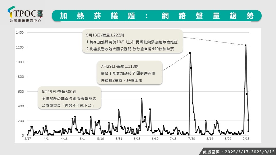 7月19日,國健署宣佈正式開放加熱菸申請,並核准兩家資料準備較完整的業者,得以有條件在國內販售共14項品項,消息一出隨即引爆聲量,當日網路討論突破1,100則。隨後在9月13日,國健署再度核定一家美商業者可販售8款菸草柱與3款組合元件,並規劃自10月11日起上架,但因政府尚未公告「添加物管理草案」,引來「先上車、後補票」的批評聲浪。同一時間,桃園機場又爆出航警涉收賄放行旅客走私加熱菸的醜聞,雙重事件推升網路輿情,當日相關討論數量更飆升至1,222則,顯示民眾對政策透明度與執法漏洞的質疑正不斷累積。