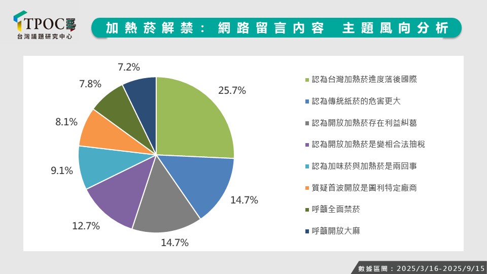 另外,將開放視為「變相合法抽稅」的聲量佔12.7%,「首波開放疑似圖利特定廠商」則有8.1%,反映民眾對政策公平性和透明度的關注。部分民眾認為政府開放的目的並非真正為了健康減害,而是藉此創造新的財源,甚至批評政策是以收稅為優先,公共衛生考量退居其次。此外,認為「加味菸與加熱菸是兩回事」的聲音佔9.1%,反映部分民眾強調加味菸爭議並非加熱菸獨有,傳統紙菸也一樣。由於加味菸議題目前尚未定案,部分輿論認為反菸民團不應在加熱菸議題上做文章。還有部分討論延伸到「全面禁菸」(7.8%)甚至「開放大麻」(7.2%),顯示加熱菸爭議已觸及公共衛生與政策價值的更廣層面。