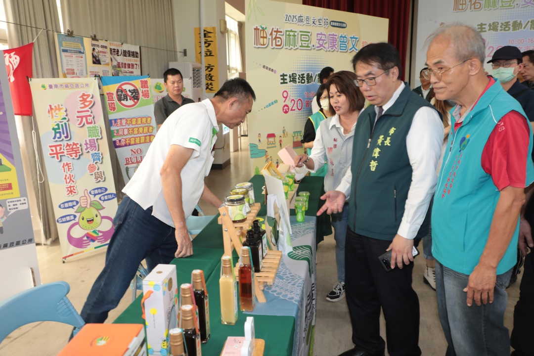 圖說:黃偉哲逐攤參觀特色農產品展示,力推正宗麻豆文旦與農創加工品 (圖/臺南農業局提供)