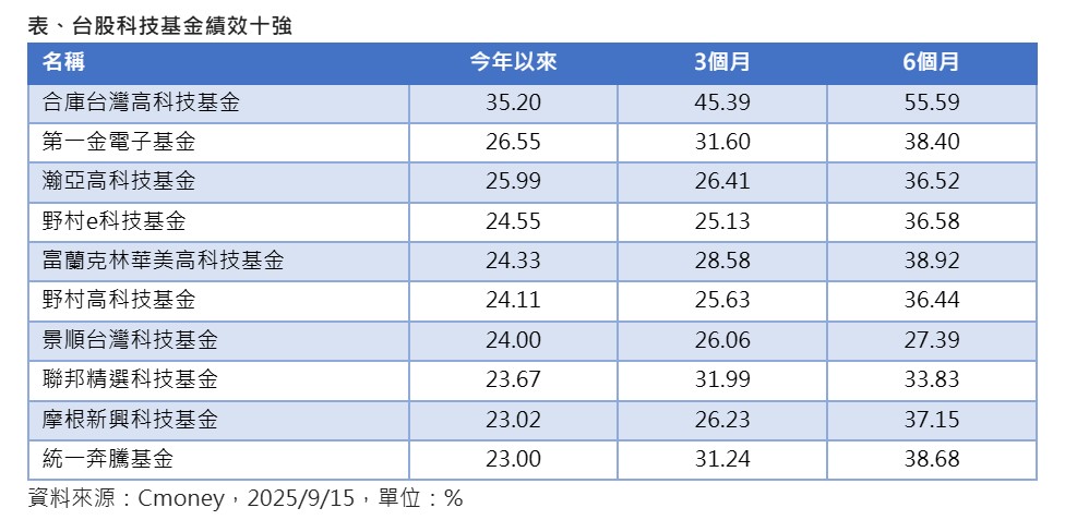 統計今年以來至9月15日,台股科技基金績效十強,報酬率皆達20%以上,其中,合庫台灣高科技基金報酬率35.2%居首,第一金電子基金則以26.55%緊追在後。