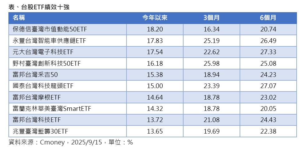 若檢視台股ETF績效前十名,保德信臺灣市值動能50ETF(009803)表現最佳,達18.2%。