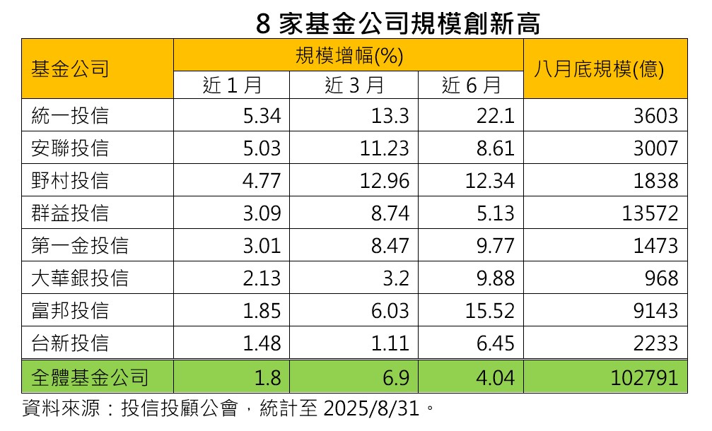 台股屢創新高,也帶動投信公司業績,統計截至8月底,37家規模加總達10.28兆元,月增幅1.8%。其中,有8家投信公司的規模創新高,月增幅領先的是統一投信的5.34%,且已連續4個月創新高。
