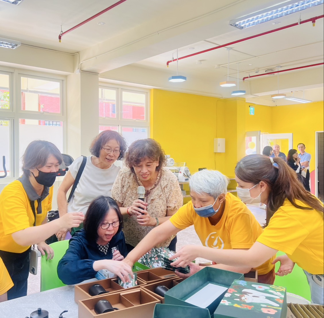 走進館內,溫馨的氛圍撲面而來,多功能活動室、簡易廚房與會談室一應俱全。在鼓峰作業設施裡,服務對象最喜愛的「咖啡禮盒包裝」活動,看似簡單的步驟,其實背後蘊含專業教保員的觀察與訓練。從細數咖啡包、擺放紙盒分隔,到小心放入咖啡壺,每個環節都由學員親手完成,逐步累積專注力與成就感。