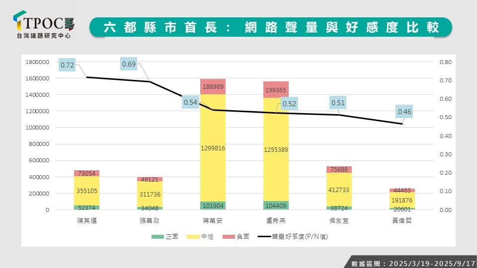 聲量破百萬的盧秀燕(0.52)與蔣萬安(0.54)雖話題熱度高,但正面效果有限。盧秀燕因大罷免、颱風救災、核三延役等議題受到關注,「粉底液事件」尤其引發軒然大波;蔣萬安則涉及闖入北檢禁制區、呼籲中央補助學校冷氣電費、拆除公館圓環等事件,增加討論量的同時,也累積不少負面評價。