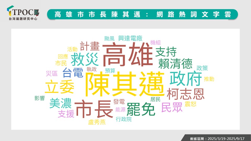 近半年(3月19日至9月17日)網路輿情分析顯示,六都市長的好感度普遍偏低。聲量接近50萬則的陳其邁在六都中獲得最高好感度0.72。正面話題主要集中在救災表現,尤其在丹納斯颱風期間跨縣市支援嘉義市,獲得網友評價「救災不分黨派」、「跨越顏色」。