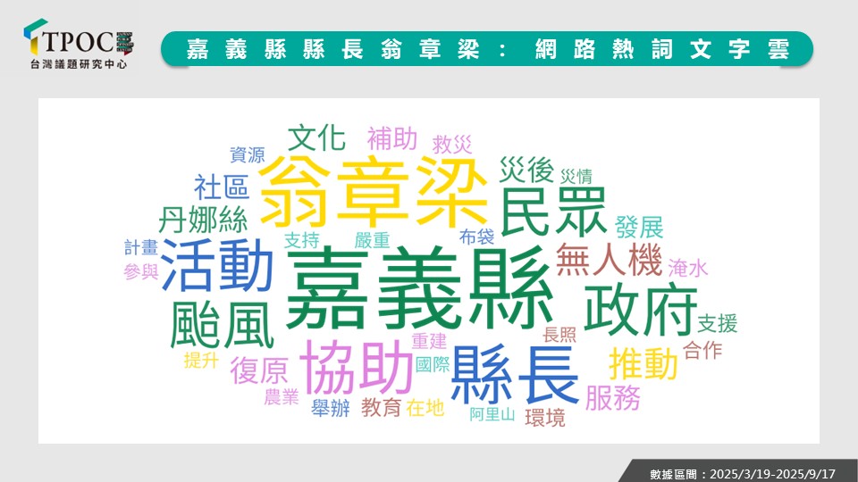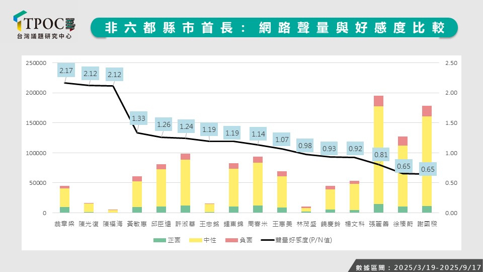 非六都縣市首長中,好感度大於1的比例較高(代表正評高於負評),前三名分別為嘉義縣長翁章梁(2.17)、澎湖縣長陳光復(2.12)以及金門縣長陳福海(2.12)。其中兩位離島縣長雖然網路聲量不到2萬則,但負面評價相對稀少,展現出好感優勢。翁章梁則兼具聲量與正面評價,討論多集中在民雄鐵路高架化、無人機新創基地與推廣農業,以及道路與人行道整修等具體施政成果,獲得網友支持。值得注意的是,嘉義縣這幾年在無人機產業的發展顯著,作為「無人機國家隊」的重要基地,翁章梁積極推動無人機在消防救災、農業管理與公共安全上的應用,使嘉義縣在地方治理中展現出創新與前瞻性。
