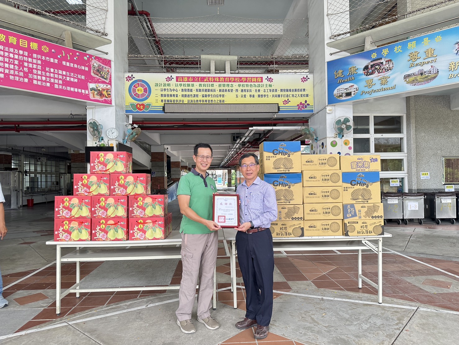 ↑圖說:大林煉油廠副廠長陳福榮(右)代表公司致贈暖心物資,仁武特殊教育學校校長戴官宇(左)回贈感謝狀(圖片來源:中油大林煉油廠提供)