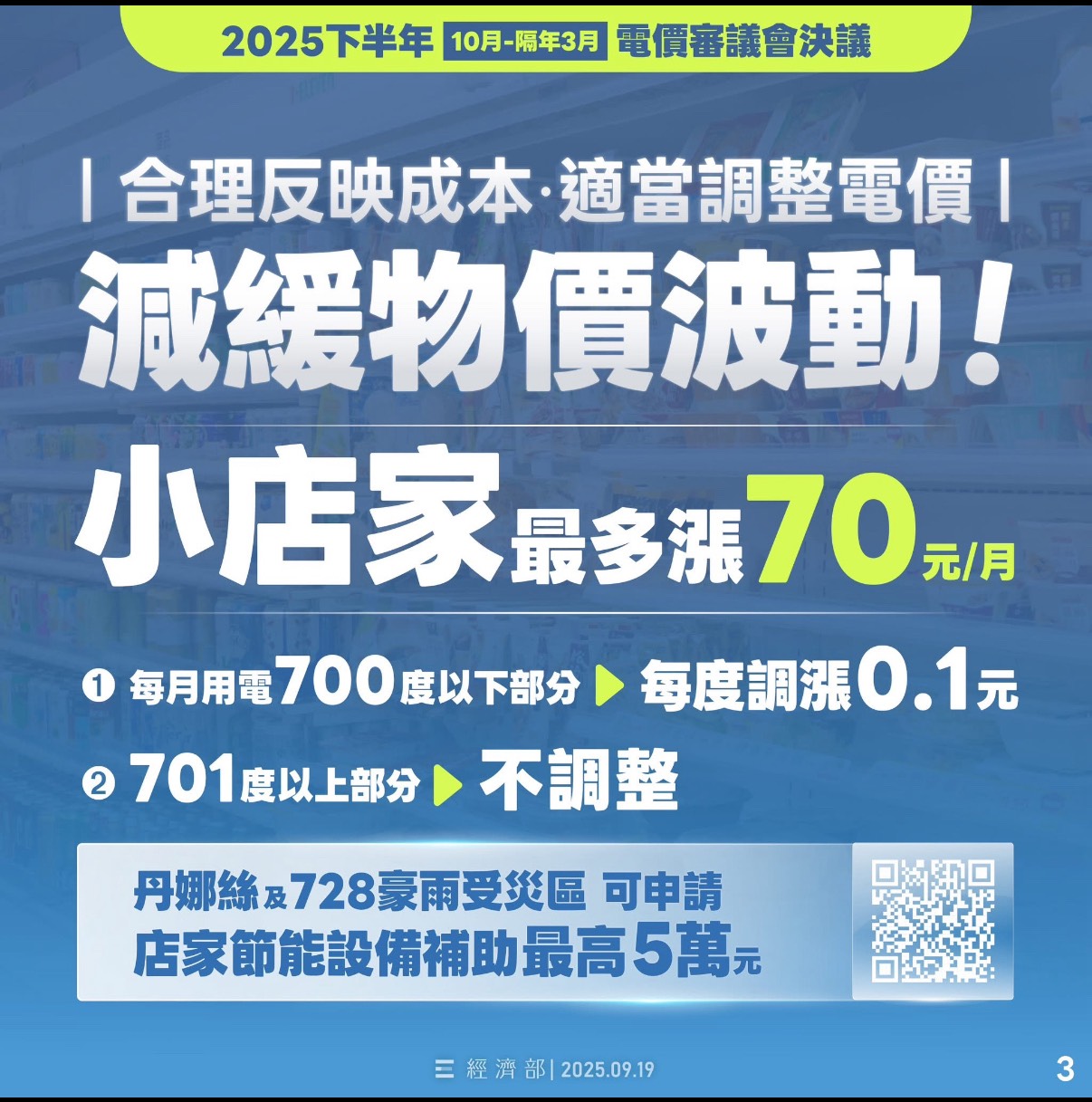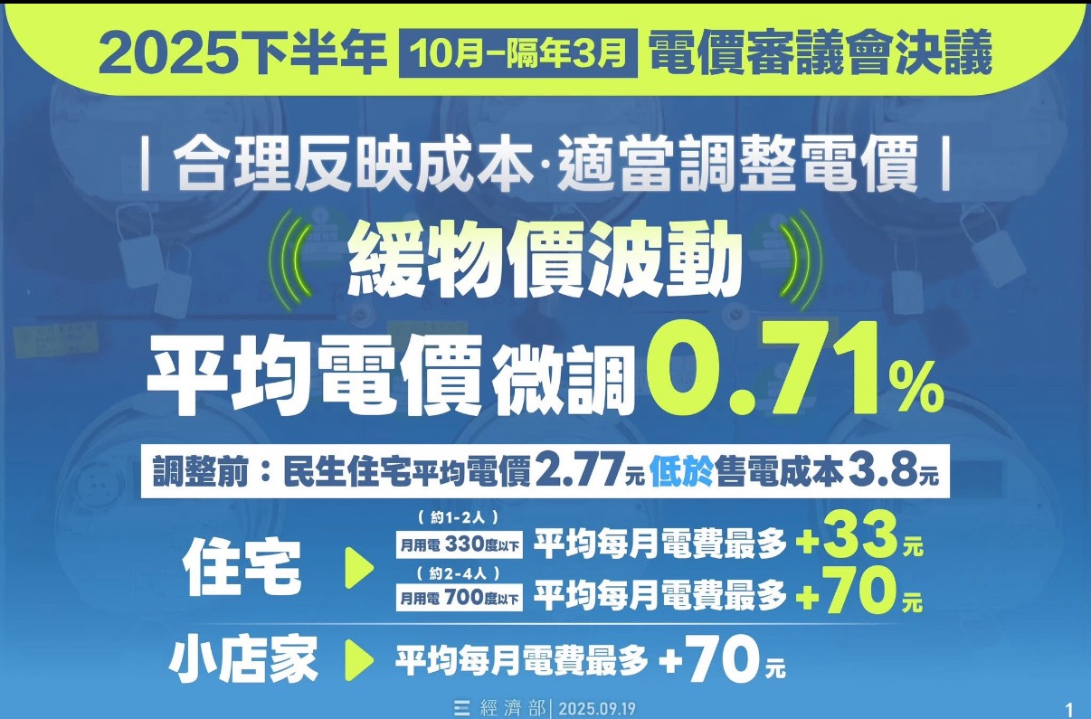 經濟部今(19)日召開114年第2次電價費率審議會,審議下半年(10月至3月)的電價費率,考量電價仍未能反映成本且台電鉅額虧損的情形下,電價仍須適度反映。由於產業電價已足額反映成本,但民生電價長期低於供電成本,因此審議會決議,產業電價不調整,民生電價則微調各級距單價,平均電價調整0.71%。