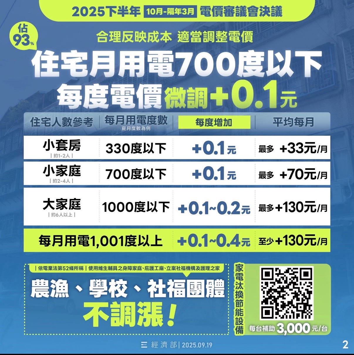 至於農漁、學校(幼兒園至大學)、社福團體及使用維生輔具的身障家庭,此次決議電價不調整。