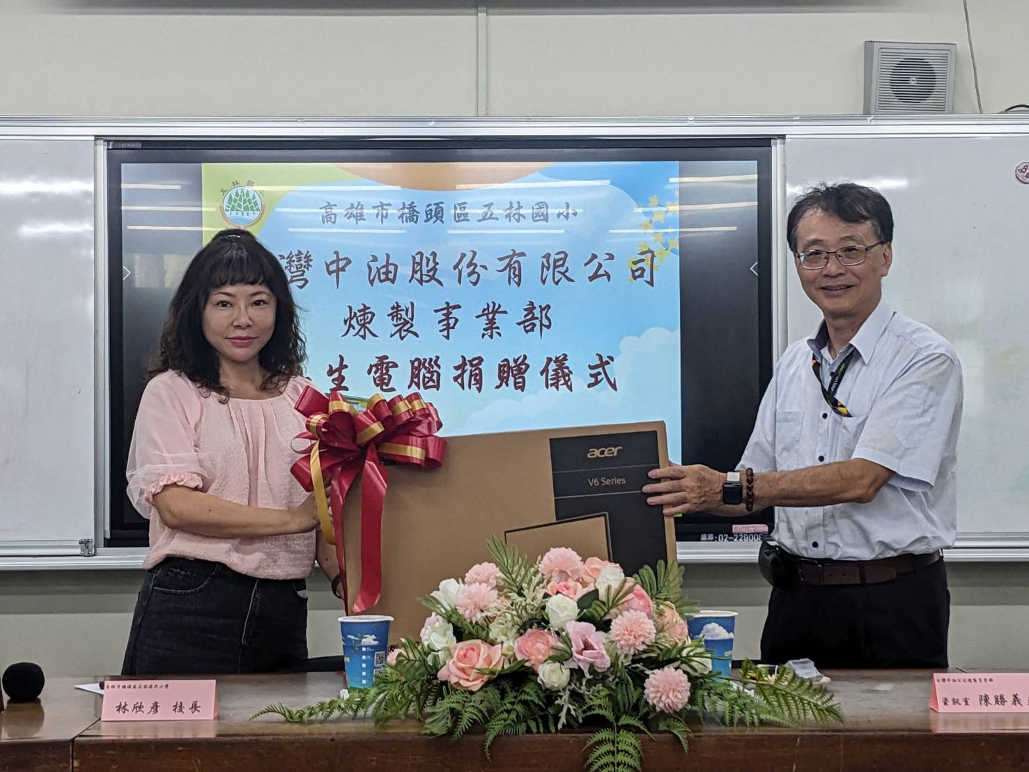 圖說: 中油公司煉製事業部資訊室主任陳勝義(圖右)代表捐贈再生電腦予五林國小,由林欣彥校長(圖左)代表接受。(圖片來源:中油公司煉製事業部提供)