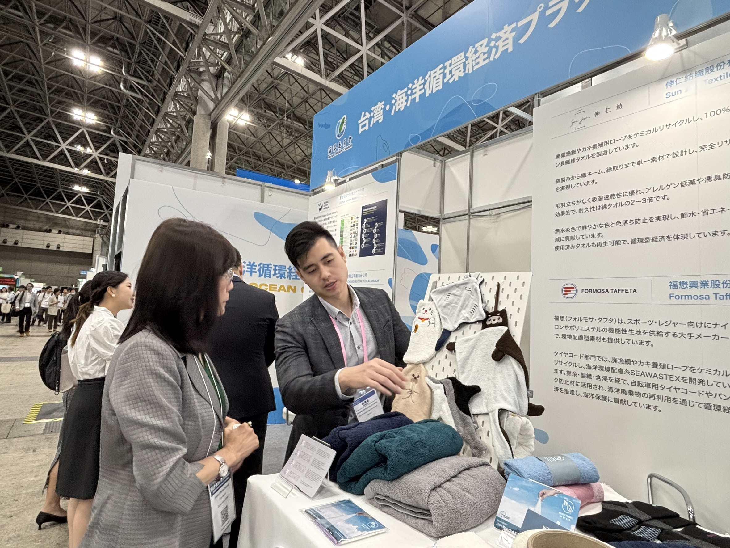 位於日本千葉的2025循環經濟展(Circular Economy EXPO)中,吸引逾500家企業,臺灣館一亮相便獲得國際高度關注。遠東新世紀展出全球領先的海廢回收聚酯纖維、伸仁紡織以回收漁網打造高性能布料與西裝、品卓企業將海廢塑膠轉化為兼具美感與實用的設計、富勝紡織展示全回收機能布料、福懋興業則以再生漁網材料成功打入國際供應鏈。