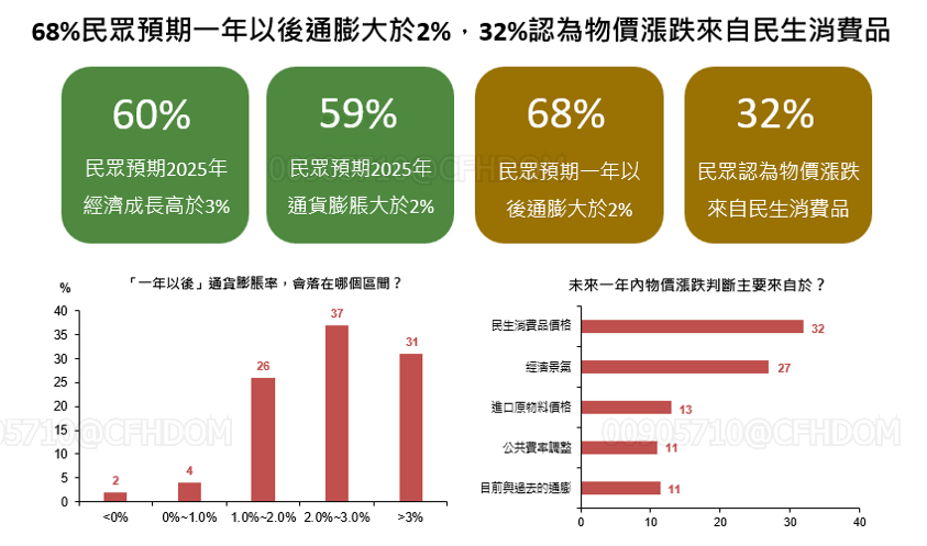 而民眾對於2025年平均通膨預期值持平在2.25%,有59%的民眾認為會高於2%。