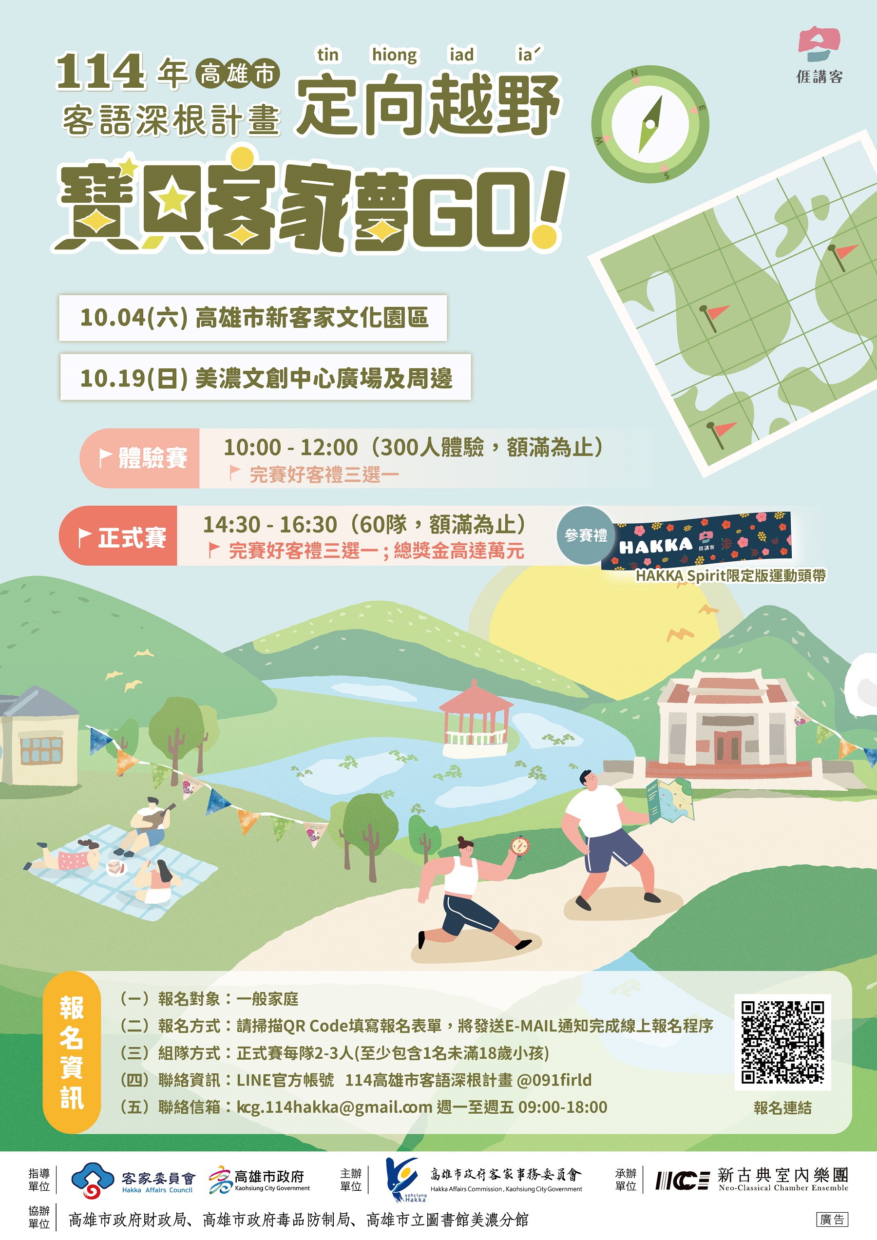學客語也能充滿挑戰與樂趣!高雄市政府客家事務委員會今年推出全新活動「寶貝客家夢GO!」,首度將「定向越野」運動與「客語情境學習」結合,打造一場既動感又充滿文化特色的語言探索賽。活動將於10月4日在新客家文化園區、10月19日在美濃文創中心接力登場。