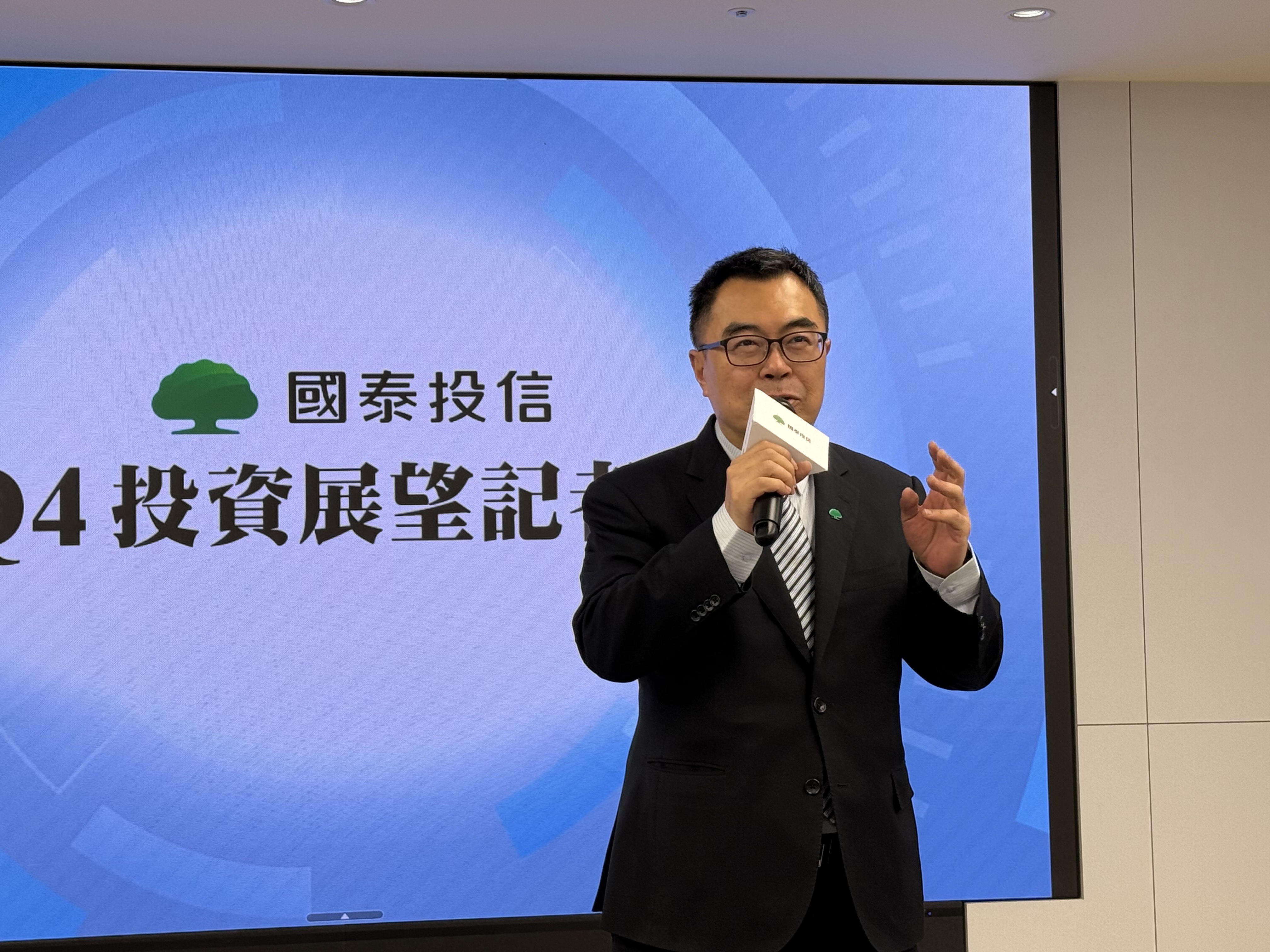 國泰投信總經理張雍川(如上圖,記者李錦奇攝影)指出,AI、半導體驅動台股的趨勢,沒有改變,研判台股第四季震盪,但會持續往上,特別是聯準會降息趨勢已經確立。建議投資人在資產配置上,可採股債雙多,並以股優於債為配置主軸。