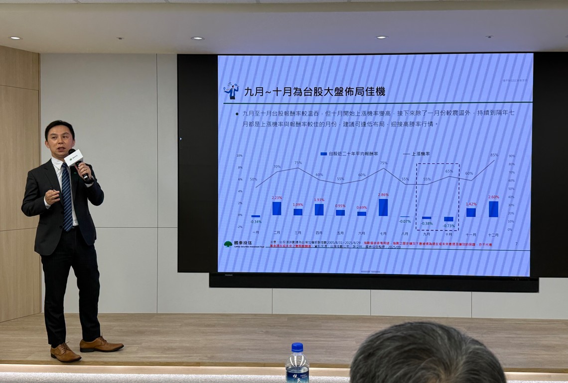 國泰投信量化投資部協理、國泰永續高股息ETF(00878)經理人游日傑指出,觀察往年9-10月台股報酬率通常比較溫吞,10月開始上漲機率變高,接下來除了1月比較震盪,行情持續到隔年7月都是上漲機率與報酬率較佳的月份,建議可把握這2個月時間,逢低佈局。(如下圖,記者李錦奇攝影)