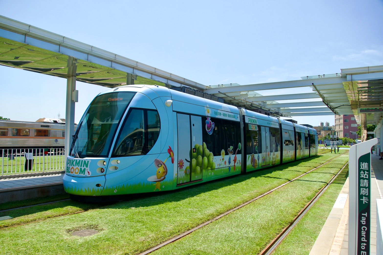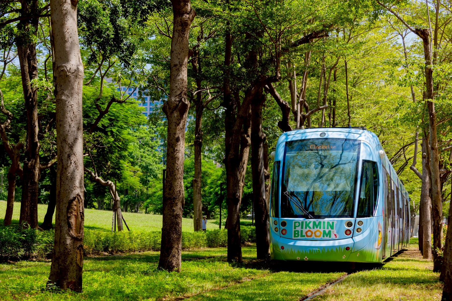 ↑圖說:「Pikmin Bloom輕軌彩繪列車」與玩家一同暢遊高雄。(圖片來源:高雄市觀光局提供)