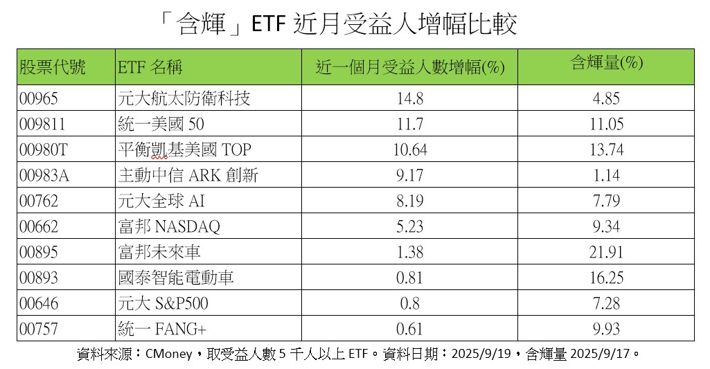 統計台灣掛牌的海外股票型ETF,成分股「含輝」的有28檔,近一個月人氣最高的3檔,受益人數都有成長雙位數以上,包括元大航太防衛科技(00965)、統一美國50(009811),以及平衡凱基美國TOP(00980T),其中又以平衡凱基美國TOP(00980T)含輝量最高,輝達成分達雙位數的13.74%。