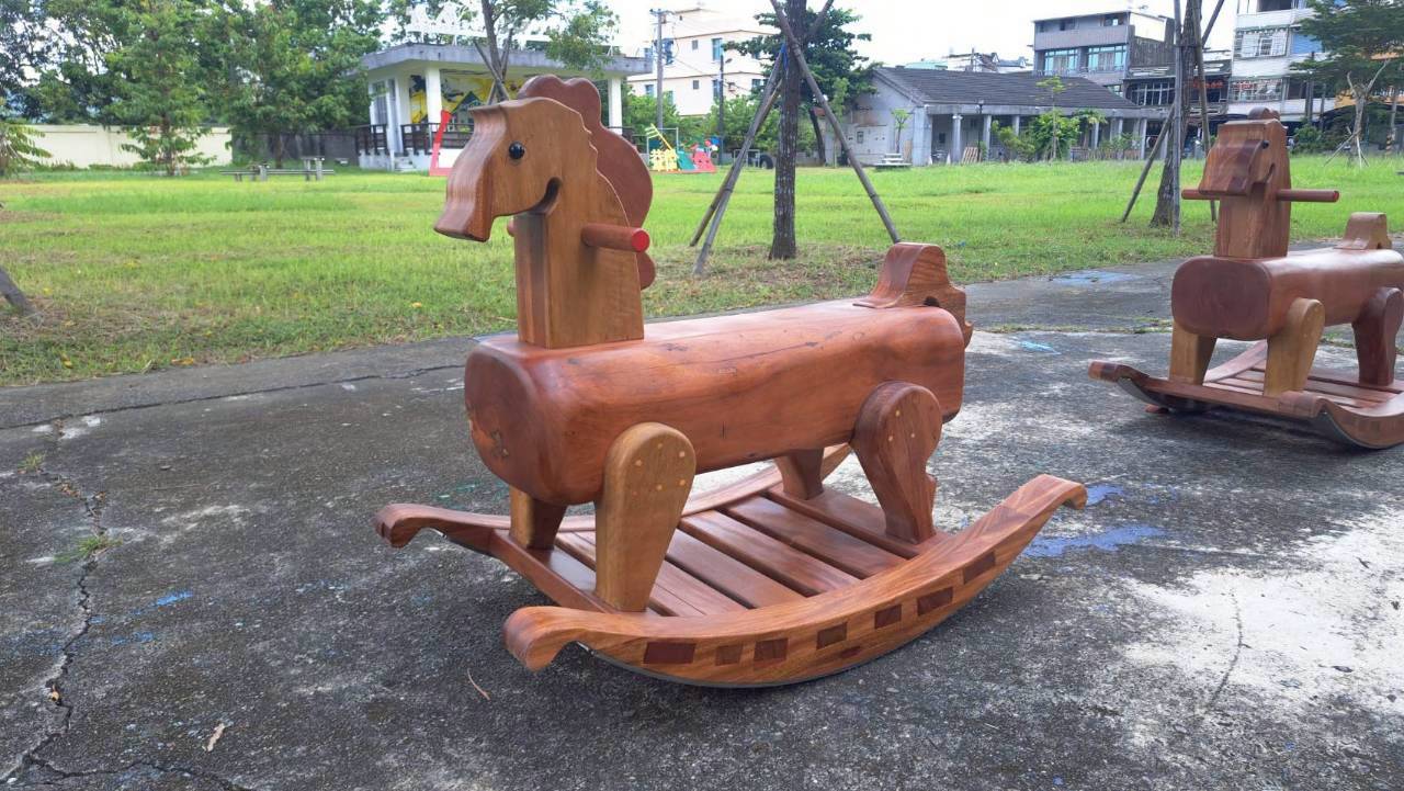 ↑圖說:本次神農市集以「綠植生活+」為主題,利用風倒木打造四隻創意木馬提供親子乘坐與拍照打卡(圖片來源:高雄市農業局提供)