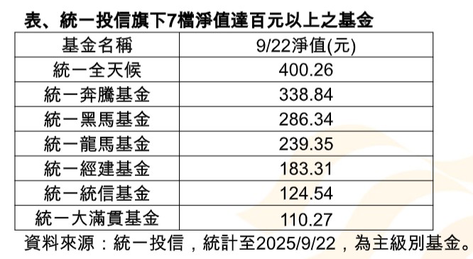 包含淨值王:統一全天候基金在內,統一投信旗下一共有7檔基金淨值達百元以上,同步在9月間創下新高。像是基金淨值排行榜第二名:統一奔騰基金,今天淨值來到340.64元,也是基金淨值300元俱樂部的唯一成員。