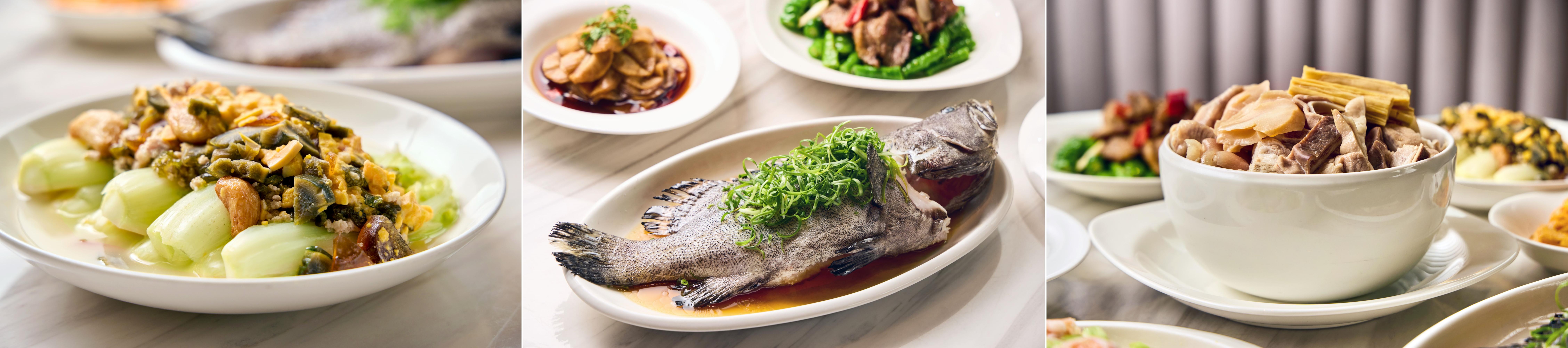 ↑圖說:「金銀蛋雨菇娃菜」結合南台灣特有的雨來菇(左);「青絲玉露龍虎斑」選用當季鮮活龍虎斑現點現煮(中)壓軸湯品「胡椒螺頭燉豬肚」(右)既暖胃又暖心。(圖片來源:高雄萬豪酒店提供)