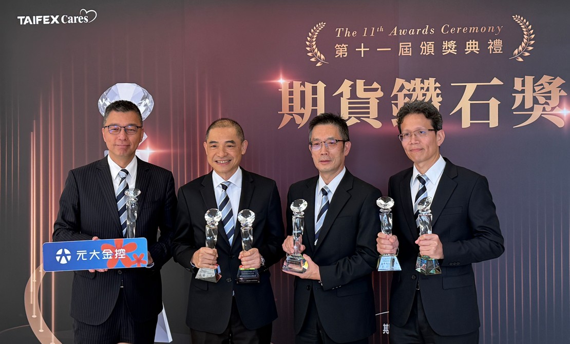 第11屆期貨鑽石獎,25座獎項涵蓋「交易量鑽石獎」、「交易量成長鑽石獎」、「造市績效鑽石獎」、「店頭集中結算量鑽石獎」,展現期貨市場多元參與者的專業實力與持續努力。