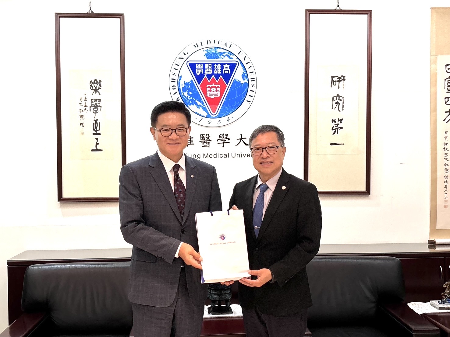 ↑圖說:余明隆(右)歡迎南韓漢陽大學李基晶到訪。(圖片來源:高醫大提供)