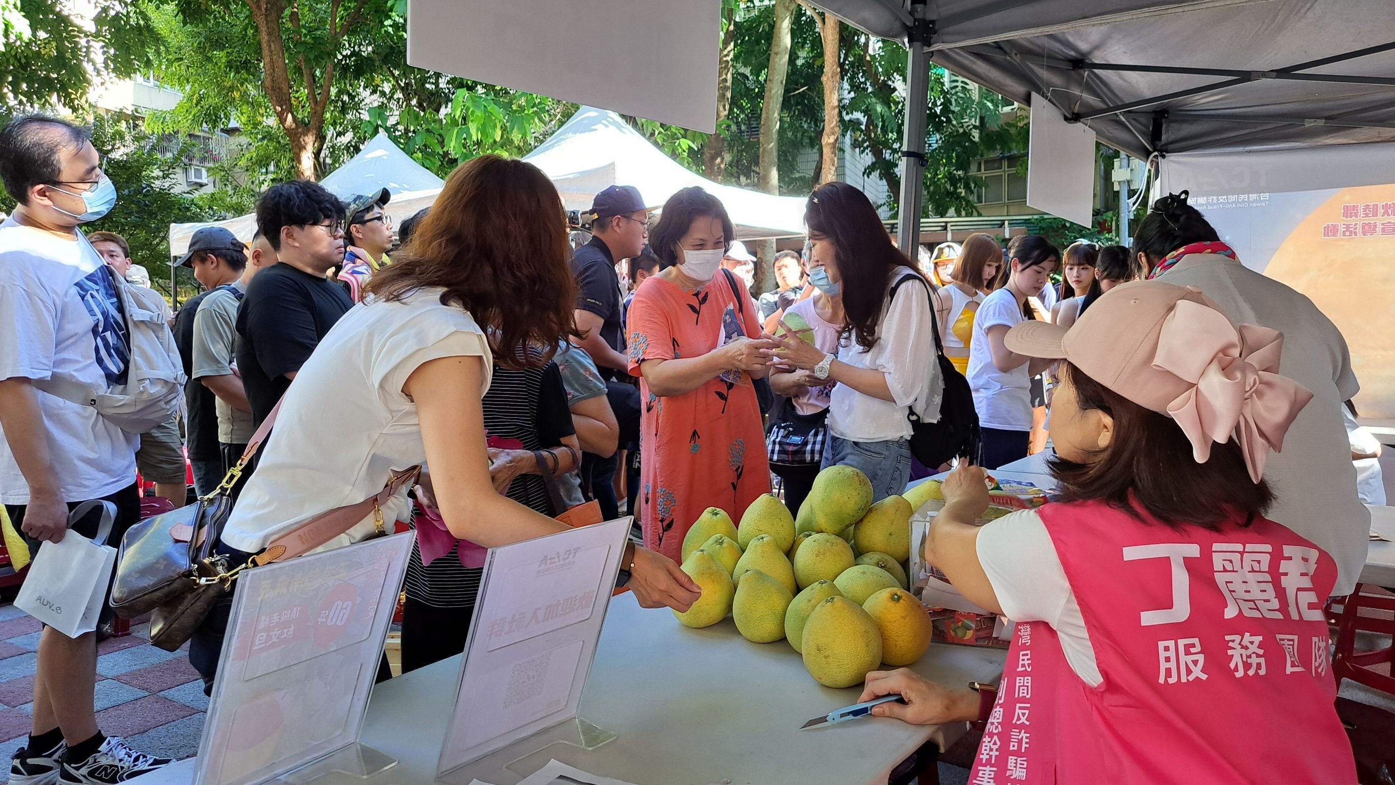 圖說:協會於現場發送柚子及餐點,並設計多項反詐互動遊戲,讓民衆在歡樂中學習防詐技巧。