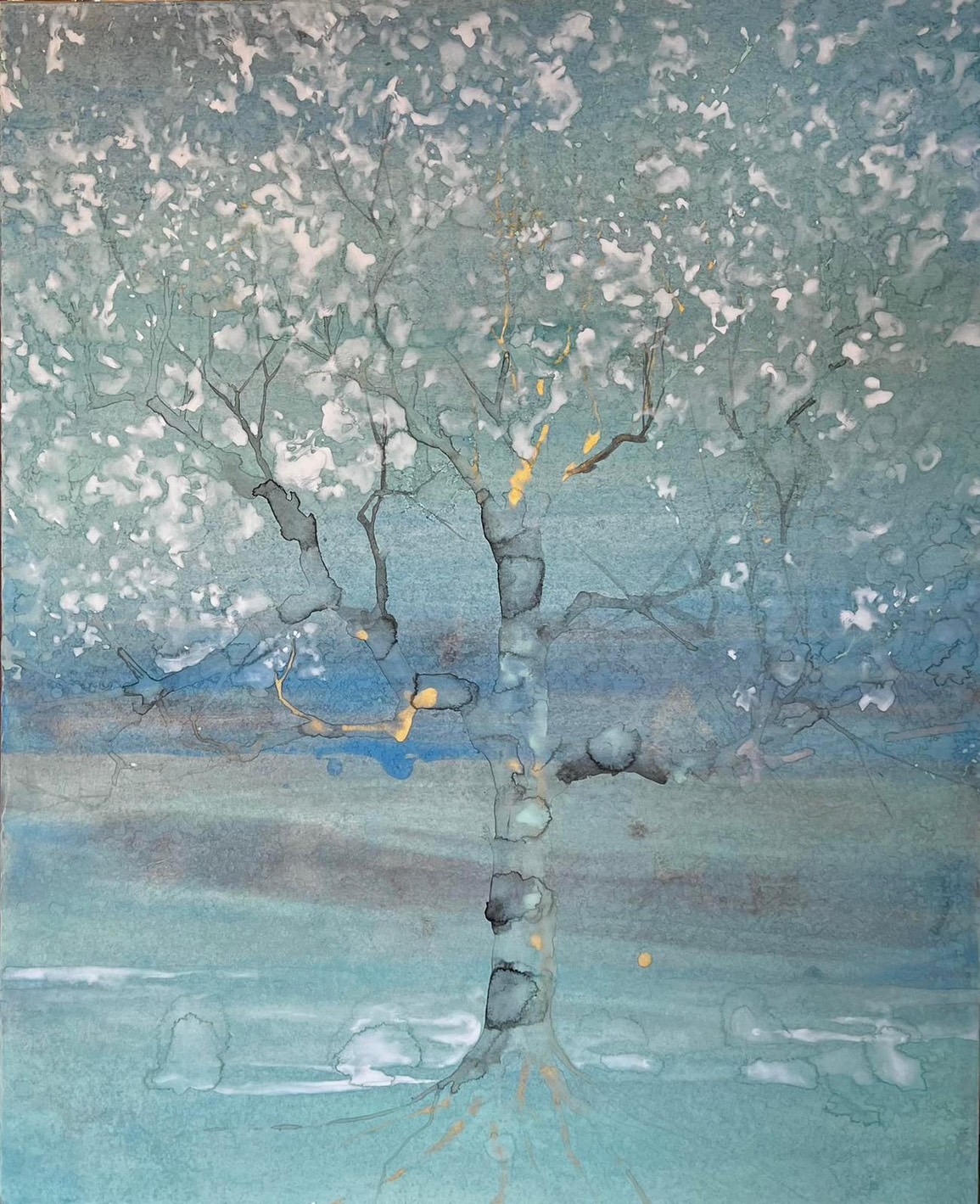 ↑圖說:藤村真長年以日本畫技法為基礎,結合當代觀念進行創作。他筆下的光,是潛藏於層與層之間的留白,而畫面上顆粒較大的礦物,亦促