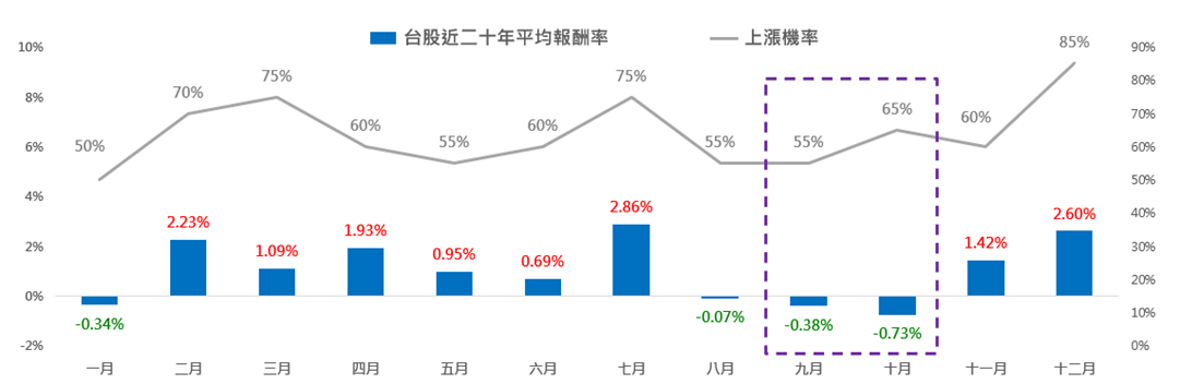 展望盤勢,國泰投信表示,統計過往20年台股走勢,10月雖為報酬率最低的月份,但上漲機率已逐漸升高,建議投資人留在市場上,採定期定額不停扣策略,並於拉回時逢低加碼,以迎接年底旺季行情。