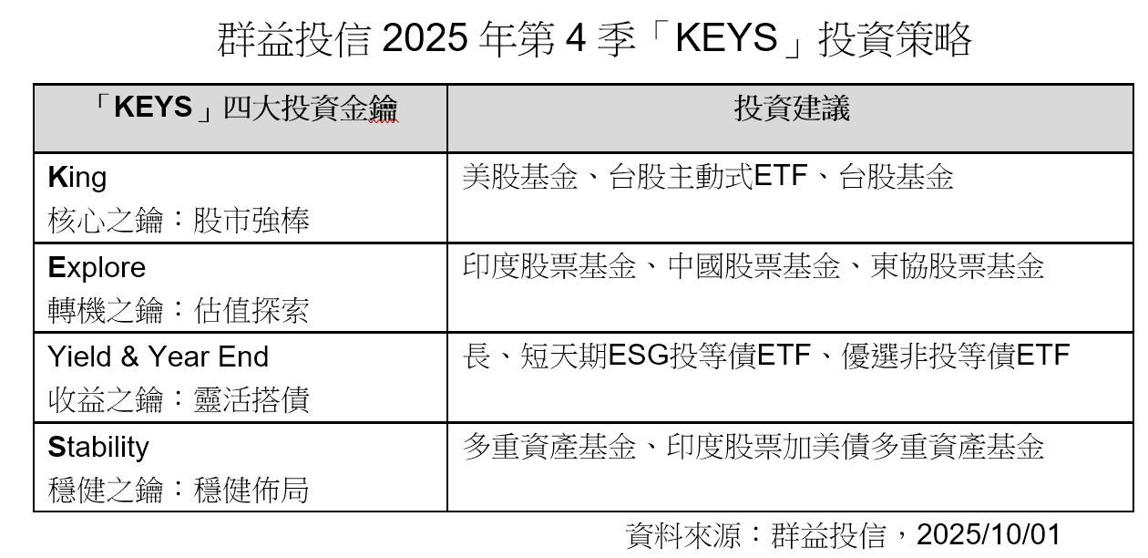 群益投信發表Q4投資展望,建議投資人可採「KEYS」投資策略,透過4大投資金鑰以兼顧核心配置與新興契機,同時運用多元資產靈活應對市場變局,以在挑戰與機會並存的環境中,精準解鎖關稅動盪後的投資新局。