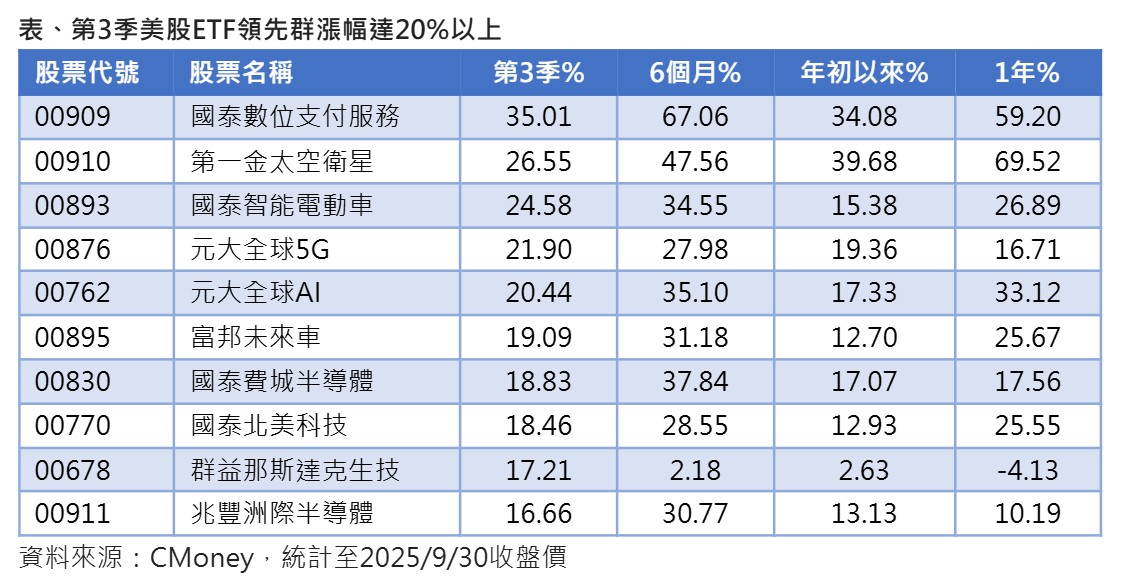 第三季強勢美股ETF出列!統計前10強漲幅至少16%起跳,其中,國泰數位支付服務(00909)、第一金太空衛星(00910)、國泰智能電動車(00893)、元大全球5G(00876)、元大全球AI(00762)等,漲幅都超過2成,顯示數位支付、太空衛星、電動車及AI、科技等投資主題,都有不錯表現。