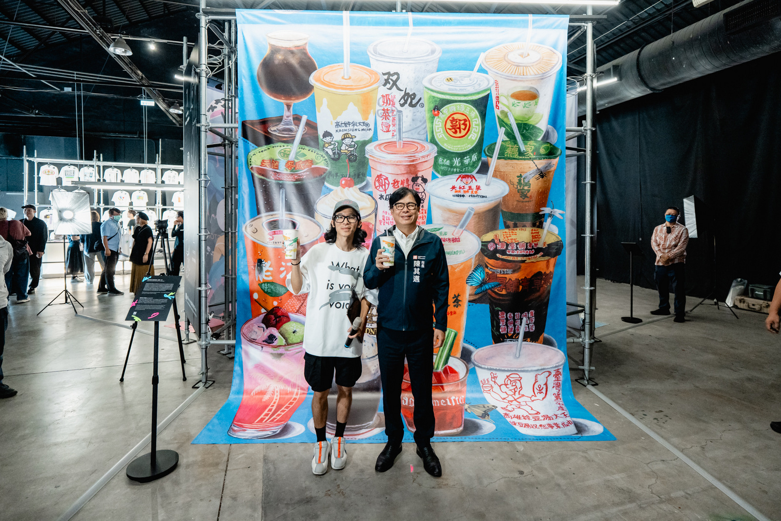↑圖說:陳其邁與策展人林唯哲手拿烏弄聯名飲料杯於「幫高調」展區李漢強作品合影(圖片來源:高雄市文化局提供)