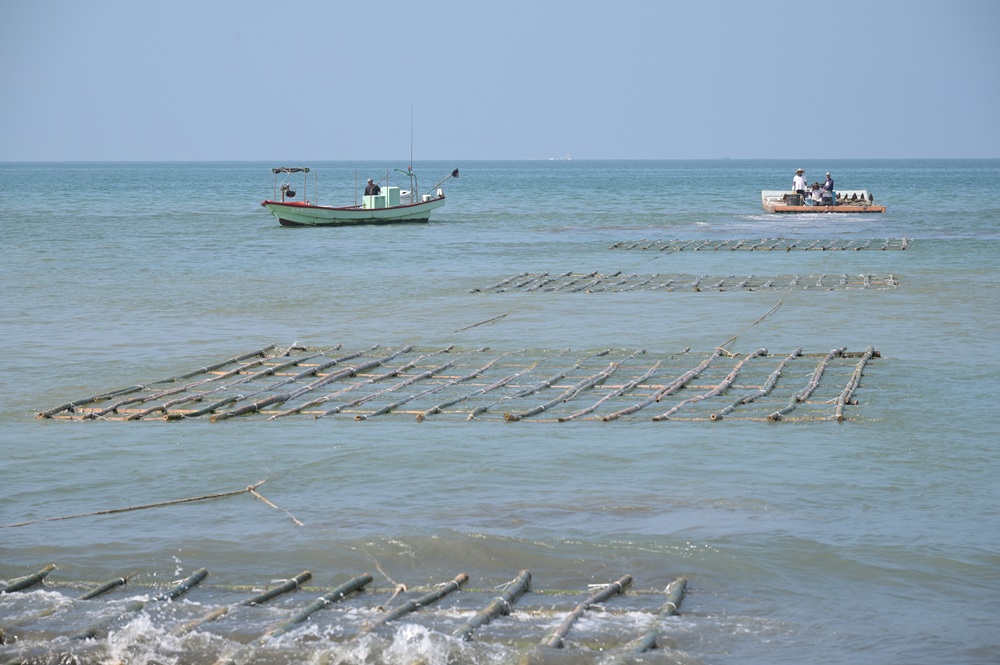 ↑圖說:蚵棚出海!活動現場將蚵農編製蚵棚送往外海移動(圖片來源:海洋委員會提供)