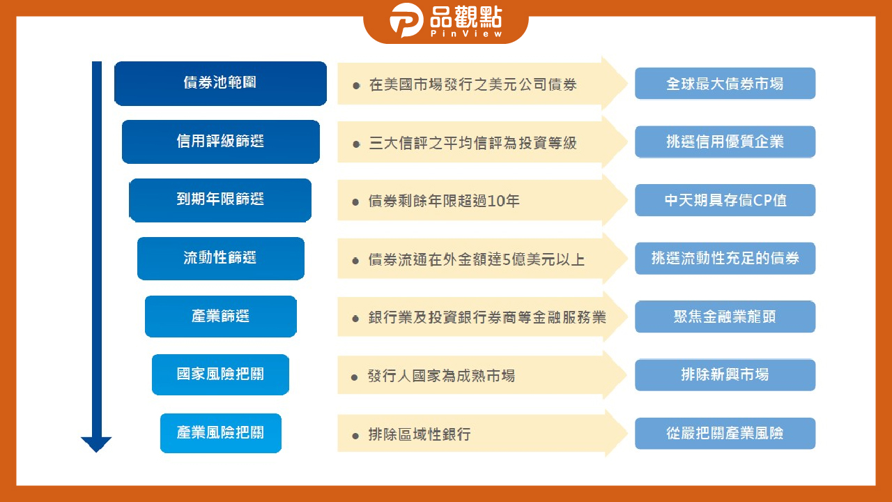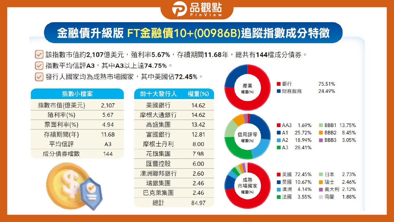 即將問世的FT金融債10+(00986B),鎖定在美國市場發行的美元公司債,清一色都是銀行及投資銀行券商等金融服務業發行,且是經過三大信評公司認定的投資等級債,並排除區域性銀行,降低風險。