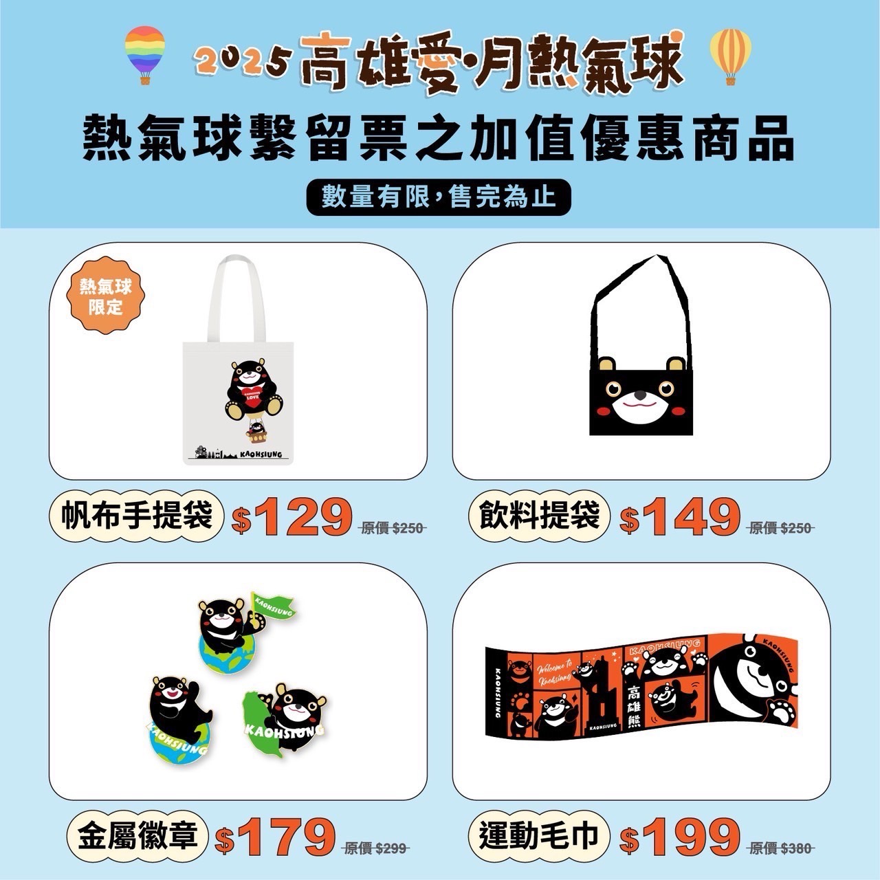 今年活動也推出限定周邊「高雄熊熱氣球帆布袋」,以及飲料提袋、漁夫帽、運動毛巾、徽章、小磁鐵等商品,部分品項可憑繫留體驗票於現場或 ibon 平台加購收藏,限量販售至10月12日止,邀請遊客把高雄的回憶帶回家。