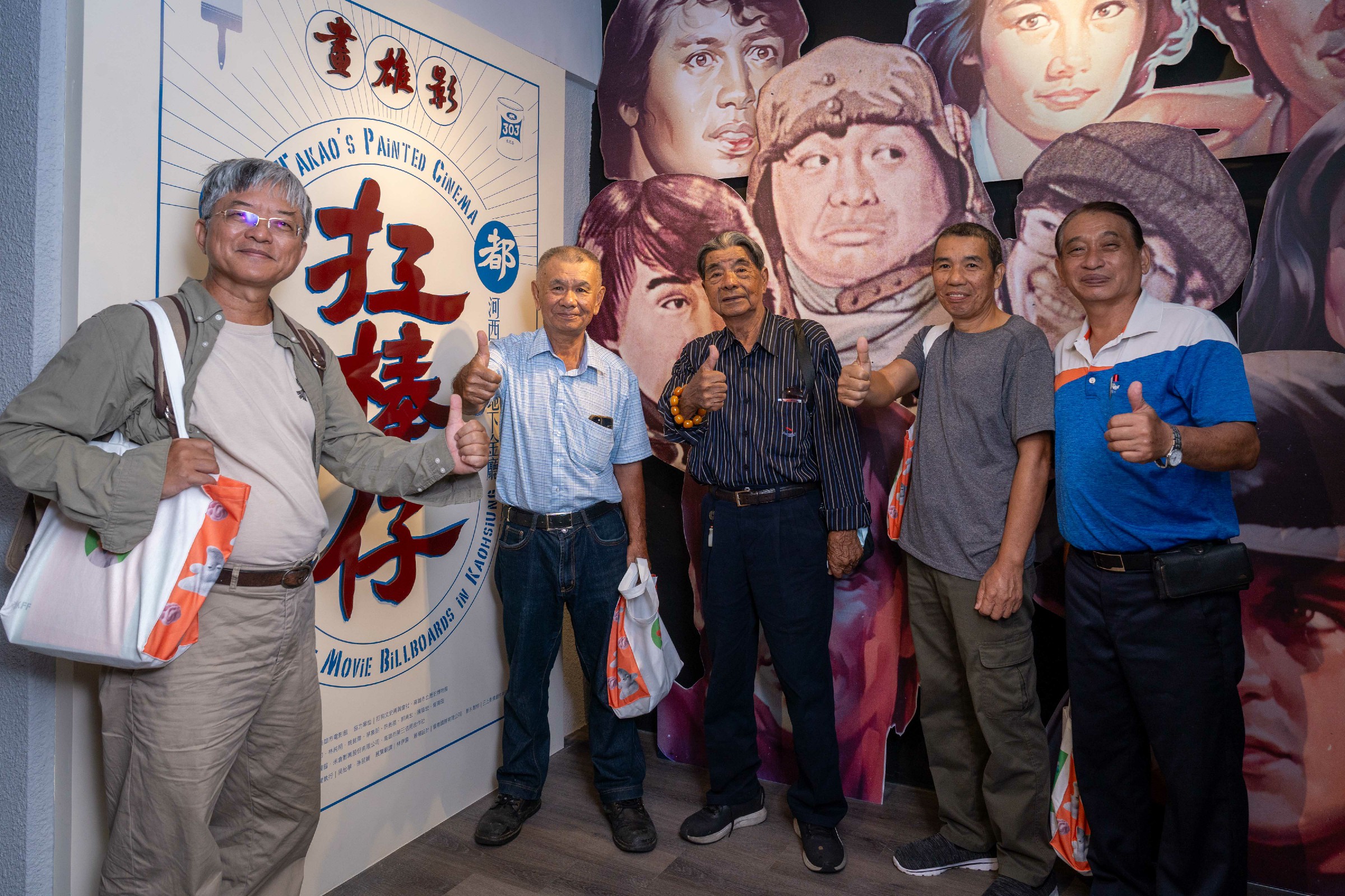 ↑圖說:畫師合照,(左起)畫師林純用、江文兟、曾清田、茅集朗、陳皆宏。(圖片來源:高雄市電影館提供)