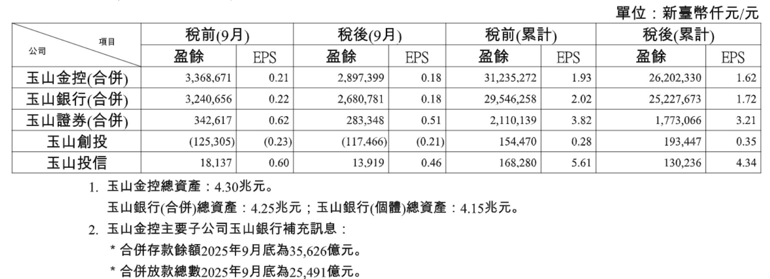 玉山金9月自結稅後盈餘29億元,略低於8月的30.94億元,但優於去年同月的24.11億元;累計今年前3季稅後盈餘262億元,創歷年同期獲利最高,較去年同期增加25.51%, EPS為1.62元。