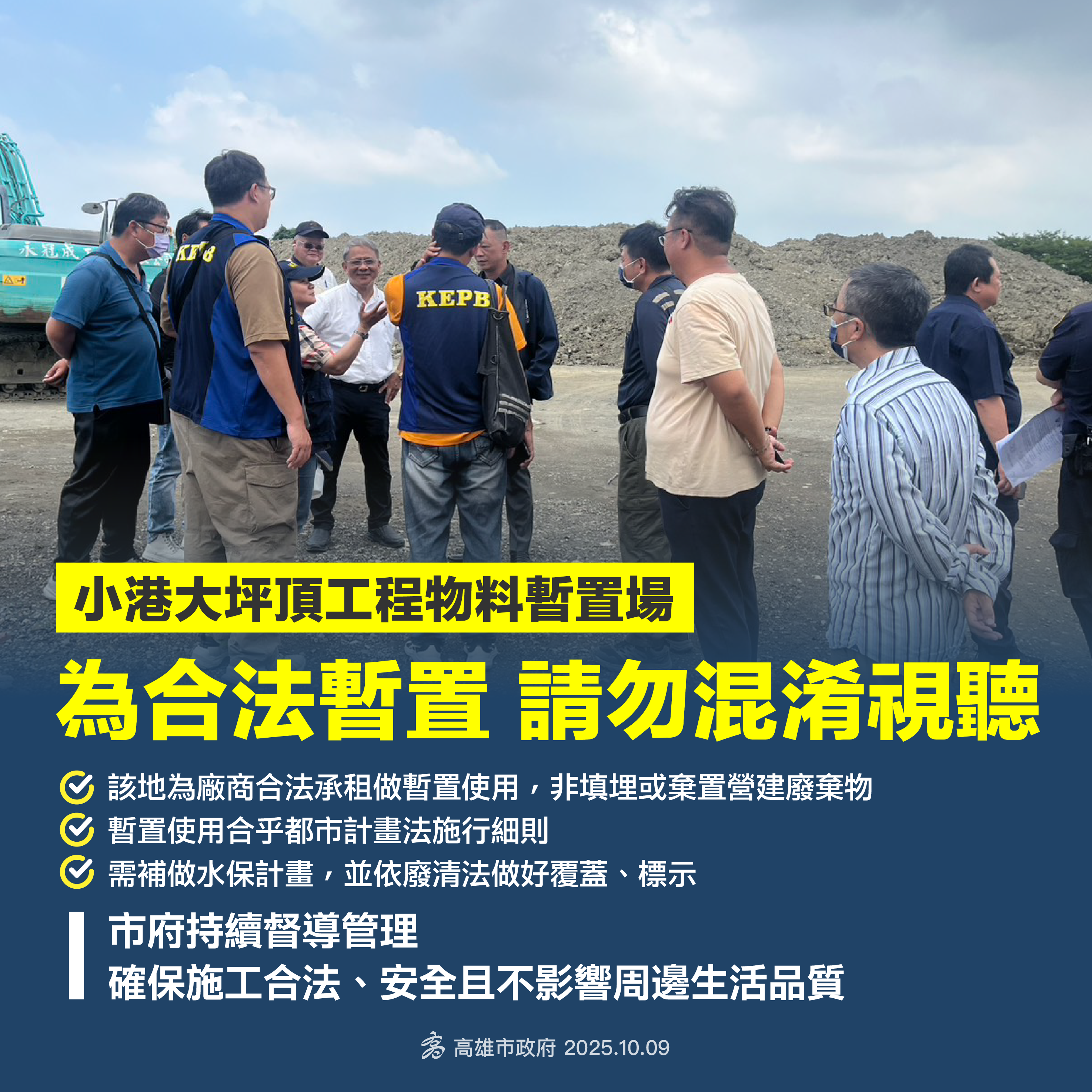 市府說明,現場為暫時堆置行為,並非整地開發或棄置廢棄物行為,已要求廠商依規補正簡易水土保持計畫。環保局同時要求在暫置期間落實《廢棄物清理法》規範,包括覆蓋堆置物及設置明確標示等措施,並持續派員追蹤改善情形。