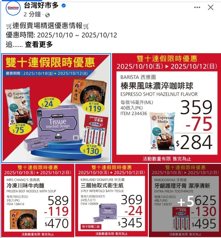 圖說:為延續中秋買氣、迎戰國慶出遊潮,好市多閃電宣布自10月10日起推出三天限定優惠,主打食品、飲品與清潔補給三大類商品,鎖定家庭主婦與露營族群的節後補貨需求。圖片來源:好市多臉書