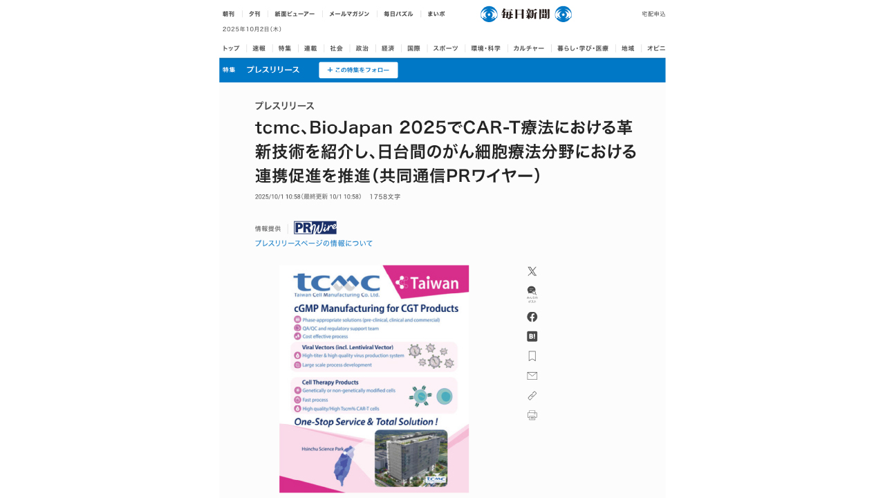 ↑(圖說 : 圖說 :台灣細胞製造公司(tcmc)參展BioJapan 2025,展現其世界級細胞製造實力與創新CDMO服務,獲得日本媒體關注報導。照片翻攝自《每日新聞》官網。)