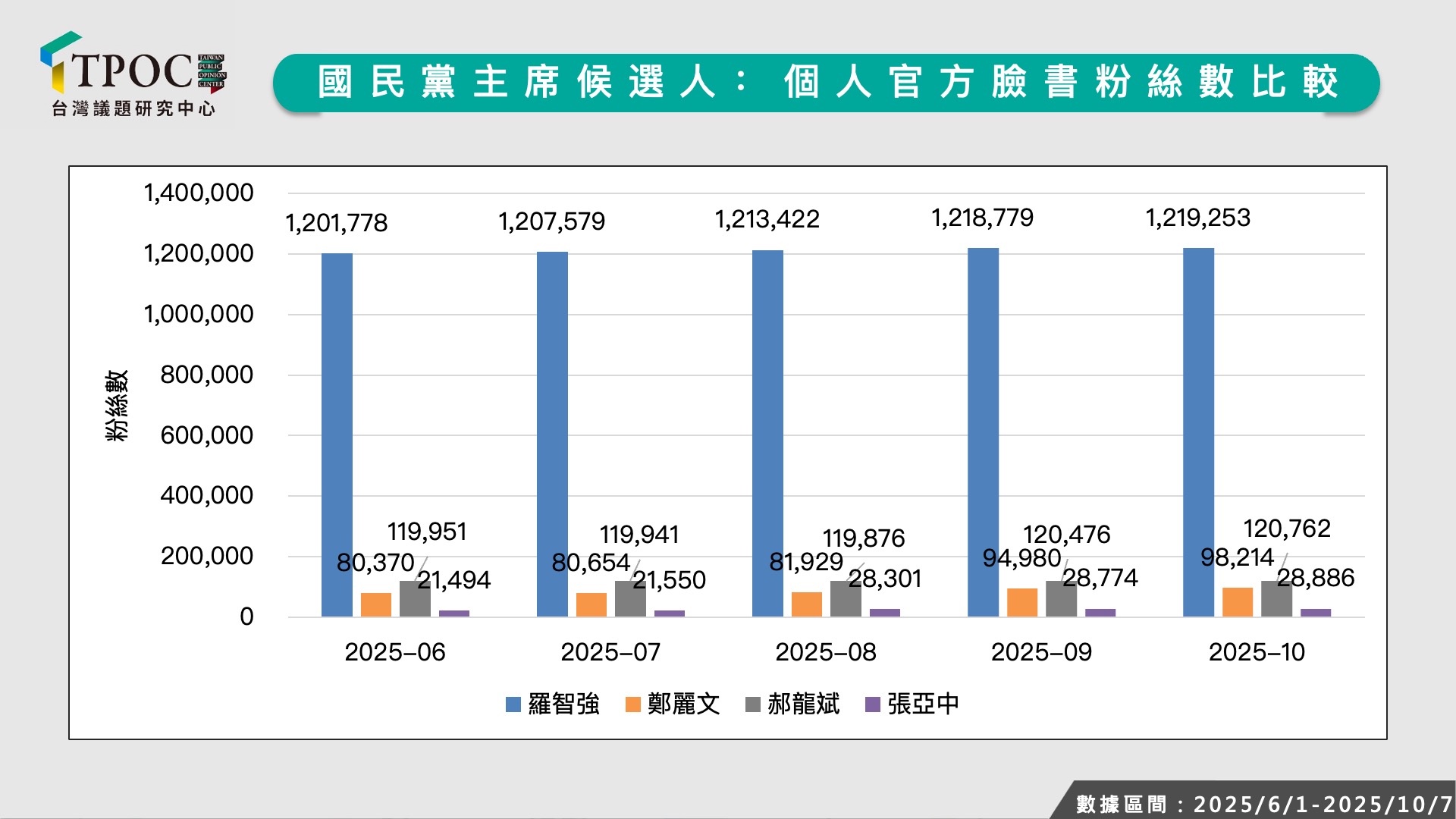 另若比較各候選人官方臉書粉絲成長情形,10月份羅智強擁有超過12.1萬名粉絲居冠,郝龍斌12萬居次,鄭麗文9.8萬排名第三,但若比較6月至10月間的粉絲數成長幅度,鄭麗文「漲粉」幅度高達22.25%相當驚人,而張亞中粉絲數從2.1萬餘人增加至2.8萬餘人。至於郝龍斌方面,雖然他原本就當過台北市長,一開始粉絲數就有11萬,且在黨主席選舉中又獲得眾多藍營要角公開力挺,在組織層面有相當不錯的支持度及看好度,但線上轉粉的能力略遜於對手,粉絲數成長幅度約0.7%,比羅智強的1.5%還要低。