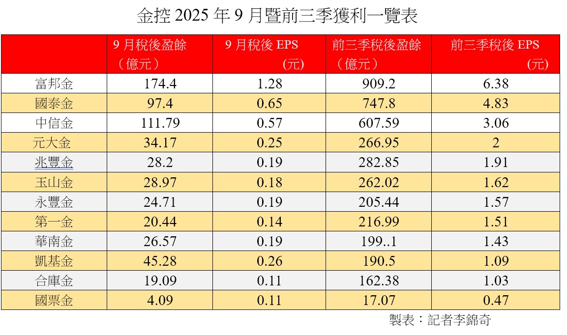中信金自結9月稅後盈餘111.79億元,累計前三季合併稅後盈餘607.59億元,每股稅後盈餘(EPS)3.06元,刷新歷年同期紀錄,蟬聯金控獲利第三名。