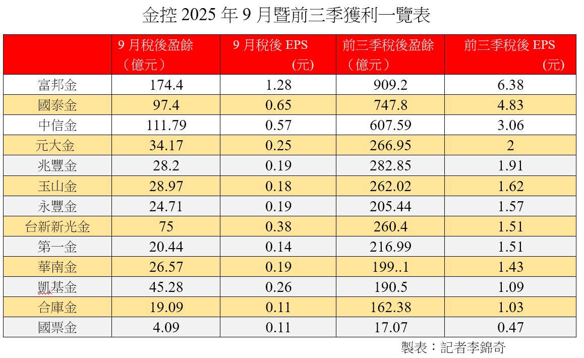 中信金自結9月稅後盈餘111.79億元,累計前三季合併稅後盈餘607.59億元,每股稅後盈餘(EPS)3.06元,刷新歷年同期紀錄,蟬聯金控獲利第三名。